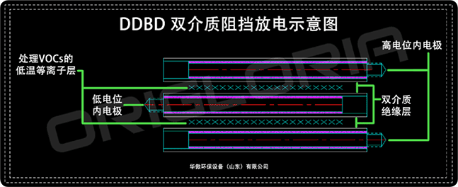 DDBD低温等离子技术是近年来一项重大科技成果,其原理为:低温等离子设备在外加电场的作用下,介质放电产生的大量携能电子轰击污染物分子,使其电离、解离和激发,然后便引发了一系列复杂的物理、化学反应,使复杂大分子污染物转变为简单小分子安全物质,或使有毒有害物质转变成无毒无害或低毒低害的物质,从而使污染物得以降解去除。因其电离后产生的电子平均能量在10ev ,低温等离子设备适当控制反应条件可以实现一般情况下难以实现或速度很慢的化学反应变得十分快速。作为环境污染处理领域中的一项具有极强优势的高新技术,等离子体受到了国内外化工废气治理方面的高度评价。