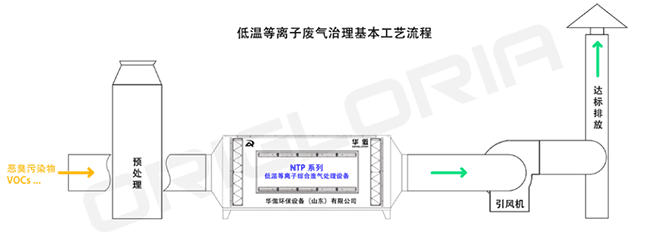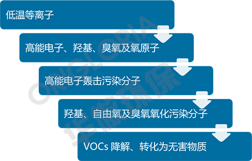 等离子体中含有大量高能电子,与VOCs气体分子或原子发生碰撞,将其能量转化为基态分子或原子的内能,使其发生激发、离解和电离,处于活化状态。同时在氧气及水蒸气的参与下产生大量H+,OH-,O-,O--,O3等活性因子,与被电子撞击后的异味气体分子发生结构重组,生产CO2,H2O等无毒无害物质,达到去除有害、有味气体的目的。