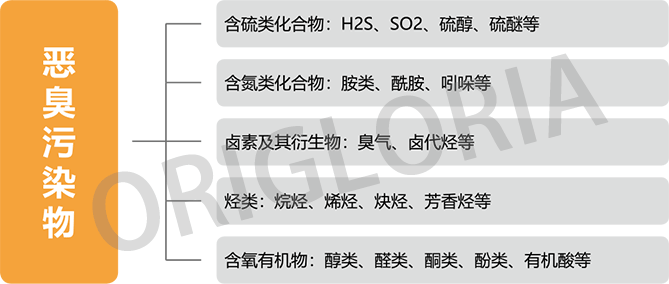 恶臭气体种类繁多,仅人类嗅觉能感知的就有4000多种,其中对人体危害较大的有50多种。按化学成分分类,恶臭污染物可分为5大类。